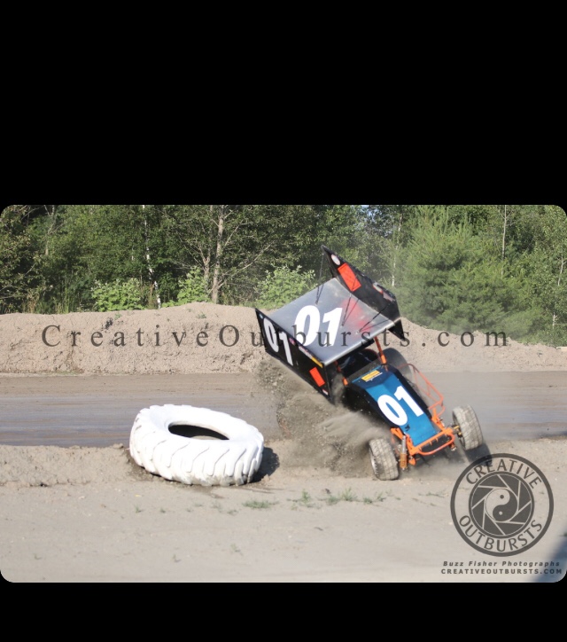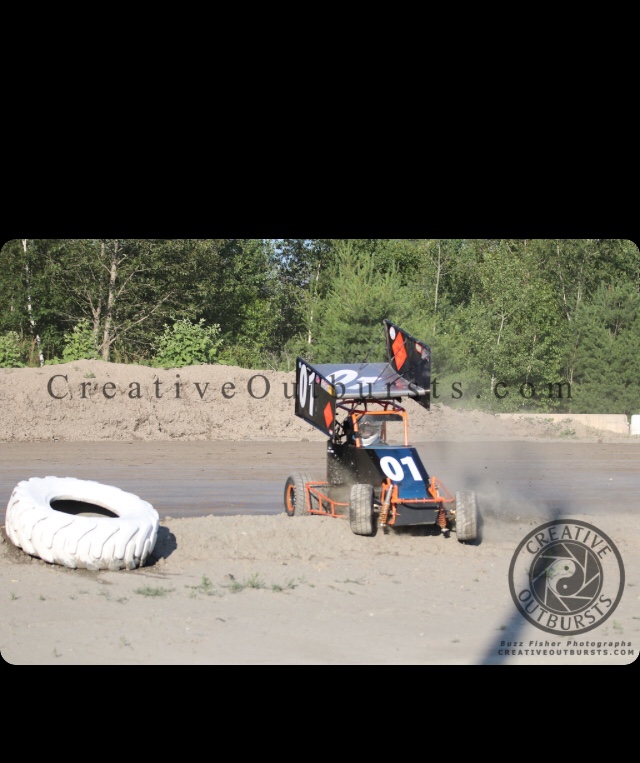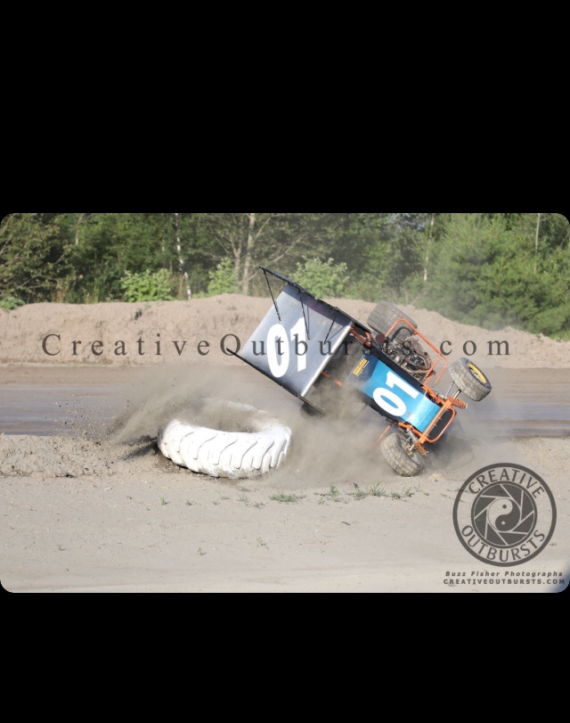 Well there was some issues with spinning out. Jr almost ended up on his lid! Thank goodness for a tractor tire and being a little heavy…. he was able to throw his weight to that left side and get the car to ever so gracefully land on all 4. Hit the button and off he went again. However he did get black flagged shortly after. Cause 3 cautions and you get sent to the pits.