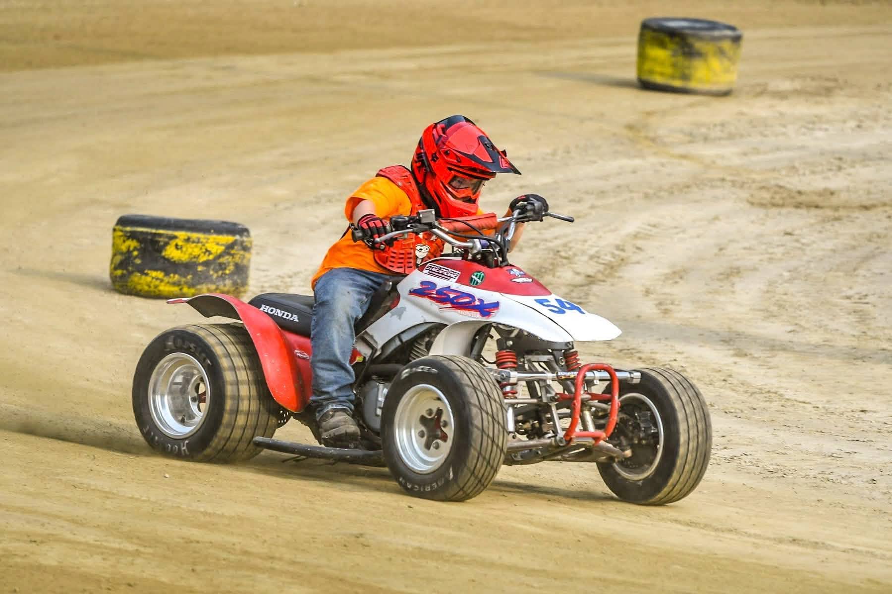 So, first off we have Gavin! Quiet soft-spoken 12 year old gentleman. He has been kicking butt out on the track with the #7 300ex! He has done 3 races with two 1st place finishes and one 2nd place ( it was a late night, had to wait for Emt to come back so racing was stopped) Mom and I joked that he fell asleep on the line. He had accidentally shifted into neutral and the pack got away from him. He wheeled the crap out of the bike and quickly got to the front and finished in a solid second place.